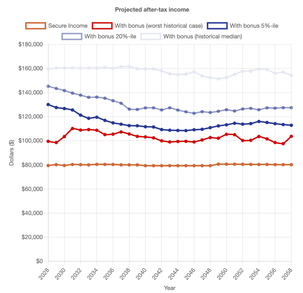 The orange line at the bottom shows the Base Income. The lines above show the total income including Bonus, also after-tax and in today’s dollars. For each year, the red point represents the lowest income outcome generated by the overlapping return sequence of equivalent length in our historical data.