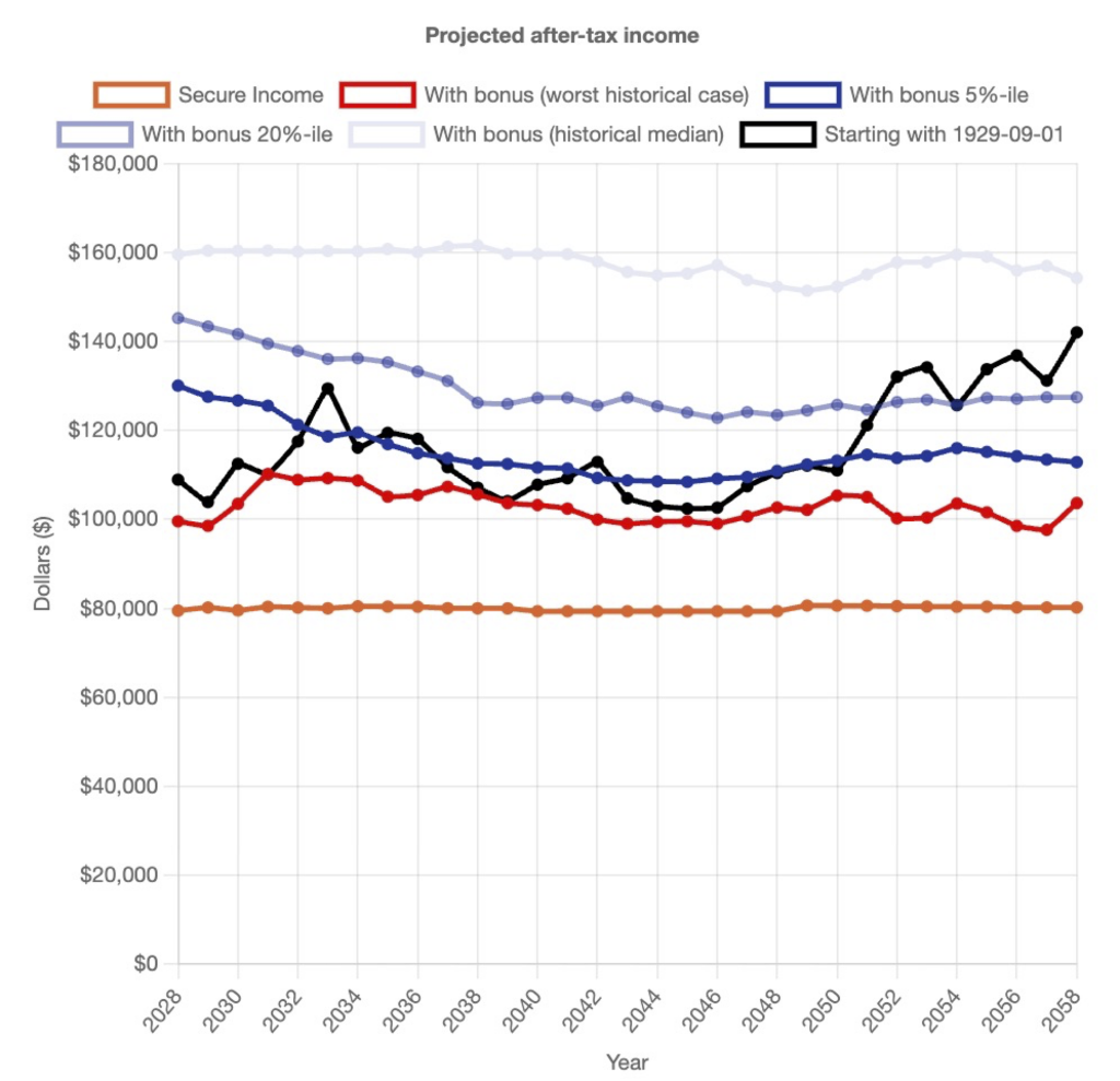 The “See how your plan would fare if stock returns during your retirement are similar to a historical period” feature illustrates what historical return sequences have looked like. Take what is perhaps the most notorious market scenario in history — the 1929 Crash. What would this household’s retirement look like if they set this plan today, and they experience the same return sequence, with a crash of the same magnitude in the first month? The black line in the graph below shows the results. If this household were to experience a replay of the stock market returns starting with the 1929 Crash, their Base income would still be met, but Bonus incomes would be relatively low in the early years. As the market recovers (in a replay of the post-war boom) the annual Bonus would increase over time.