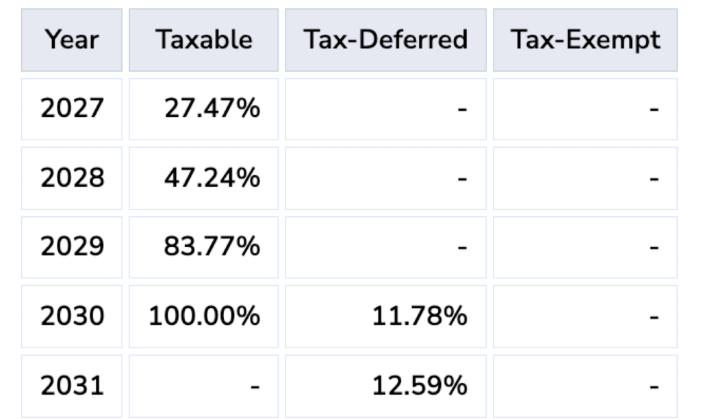 In the absence of a change to the plan, in 2028 47.24% of the stock in the Taxable bucket should be withdrawn. Dividends received that year should count towards the value withdrawn, as discussed above. In 2030, all of the remaining Taxable stock should be withdrawn in addition to 11.78% of the Tax-deferred stock. In 2041, all of the remaining Tax-deferred stock should be withdrawn along with 10.45% of the Tax-exempt stock, etc.