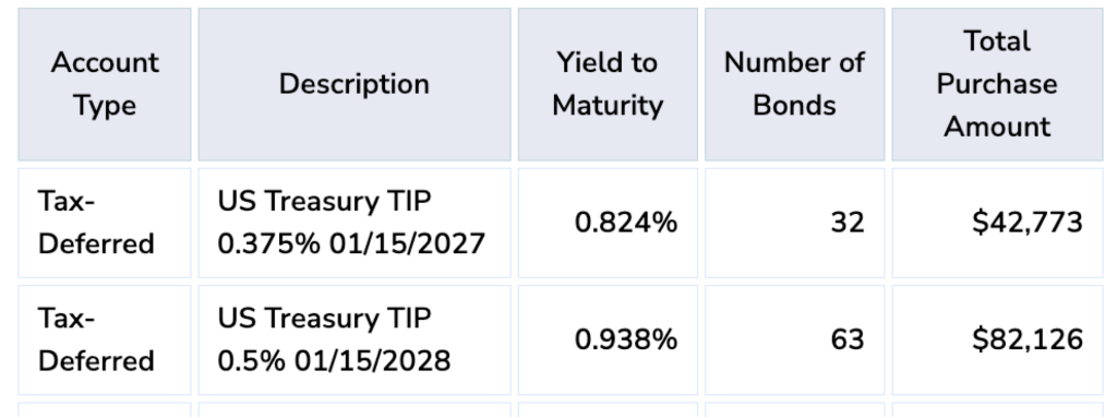 The table that appears after clicking on “Show list of TIPS to be purchased” presents all of the TIPS to buy to implement the ladder that will meet the desired Base Income target, including the tax bucket in which to buy the issue and the number of bonds to buy. The bond’s description indicates the date on which the bond will mature. The Total Purchase Amount is the cost to buy the given number of bonds, including accrued interest, based on recent prices. The actual costs fluctuate.