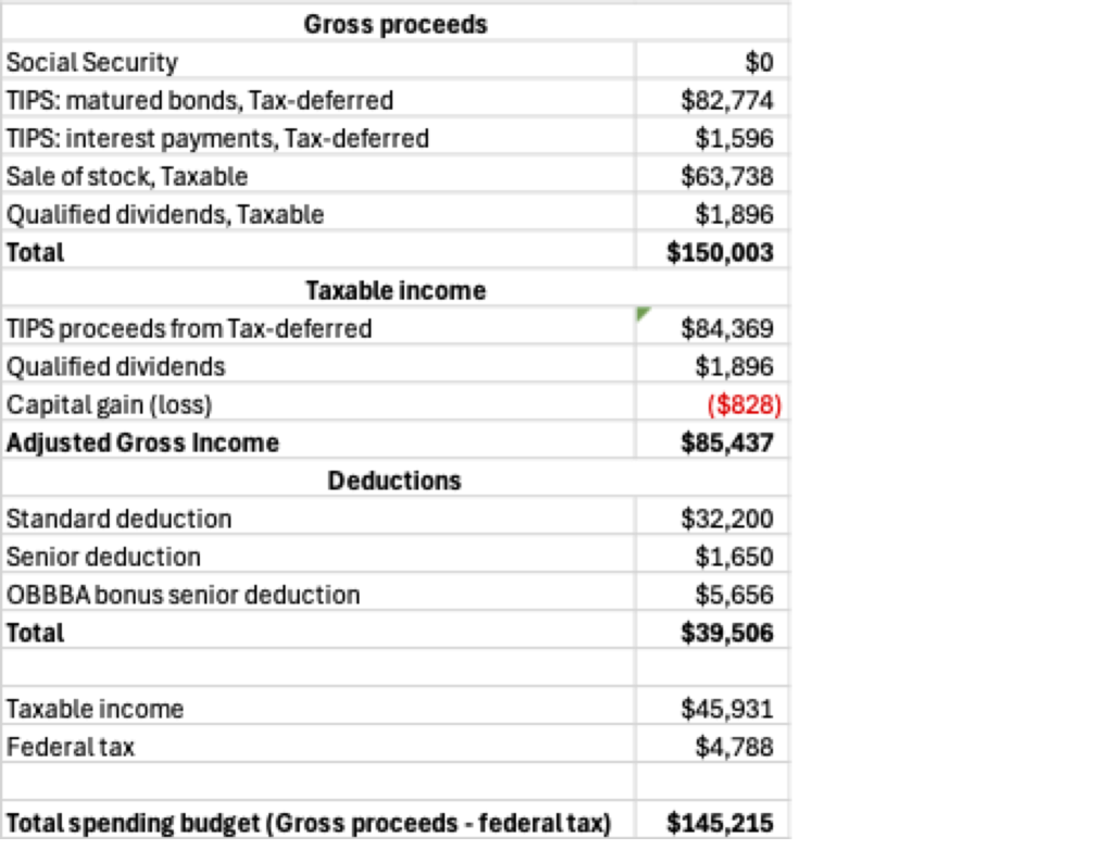 2028 is the first full year without employment income. Social Security is not tapped for either spouse yet. One of the spouses is eligible for the senior tax deduction. To attain $80,000 of after-tax real Base income, the ladder is configured to provide all the gross Base income so that the after-tax Base is $80,000. All TIPS are in the Tax-deferred bucket, so all such proceeds are taxed as ordinary income. The Bonus comes from liquidating and withdrawing stock from the Taxable account, which includes qualified dividends and sale of stock (in this case with a capital loss). The total gross withdrawal is $150,003. Estimated federal tax is $4,788. The total after-tax spending budget is therefore $145,215. The table shows the calculations.