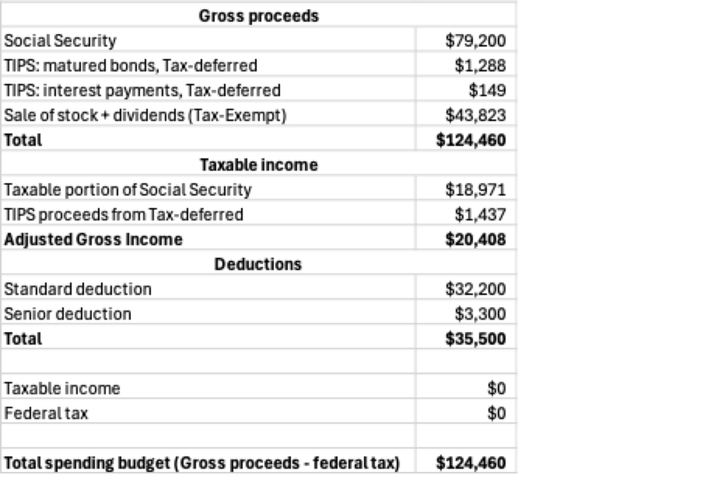 In 2049, both spouses receive Social Security, for an annual total of $79,200. Both spouses are eligible for the senior tax deduction. Based on what is known today, the current OBBBA bonus senior deduction does not apply in 2049. The stock in both the Taxable and Tax-deferred buckets would have been depleted. The entire stock withdrawal is from the Tax-exempt bucket. Only a small amount of TIPS remains in the Tax-deferred bucket, since little is required to supplement Social Security to reach the $80,000 Base income target. The taxable income from Social Security and the Tax-deferred withdrawal is less than the available deductions and no federal tax is owed. The total after-tax spending budget is $124,460.